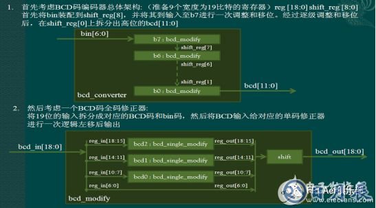 將需要轉(zhuǎn)換的數(shù)字除以“權(quán)”,然后對(duì) 10 求余,得出數(shù)字各個(gè) 位上的數(shù)字。例如:8’b1000_0000(10 進(jìn)制中的 128),將此數(shù) 字對(duì) 10 求余,得出個(gè)位“8”,然后將“8”賦給最低的 4 位。將 此數(shù)字(128)除以 10,得出 12(在 FPGA 計(jì)算中,自動(dòng)取整), 對(duì) 10 求余,然后得出十位“2”,把“2”賦給次低的 4 位。將此 數(shù)字(128)除以 100,得出 1,對(duì) 10 求余,然后得出百位“1”, 把“1”賦給另外的 4 位。這樣就轉(zhuǎn)換出了 BCD 碼。