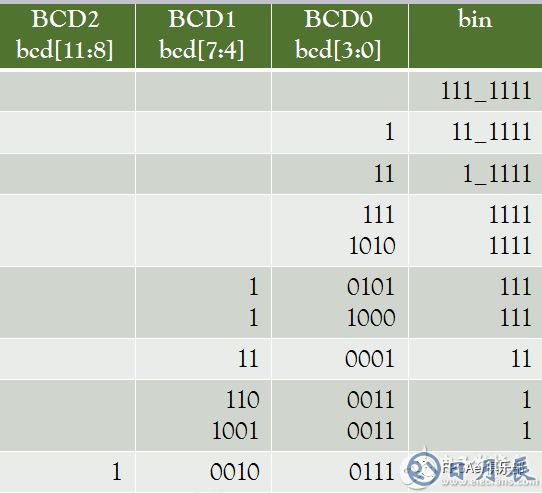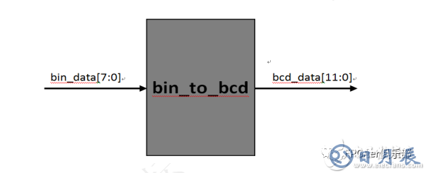 bin_data[11:0]:輸出的BCD碼(輸入的二進(jìn)制數(shù)據(jù)為8位,最大 為8’b1111_1111(255),每四位二進(jìn)制表示一個(gè)BCD碼,故而12位)。