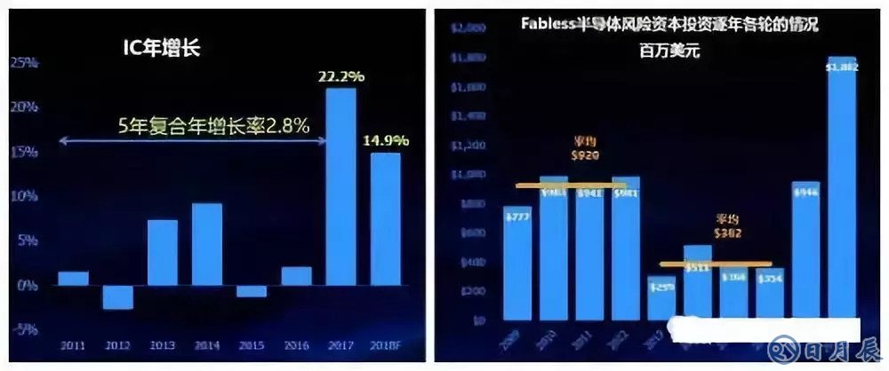 從2017年起,IC行業(yè)實(shí)現(xiàn)了22.2%的增長,遠(yuǎn)遠(yuǎn)超過2011-2016年2.8%的年復(fù)合增長率。不僅如此,2017年半導(dǎo)體行業(yè)的研發(fā)費(fèi)用增長了9.8%,F(xiàn)abless半導(dǎo)體初創(chuàng)公司的風(fēng)險(xiǎn)資本投入從2009-2012年的平均9.2億美元/年,增長至2018年18.02億美元。
