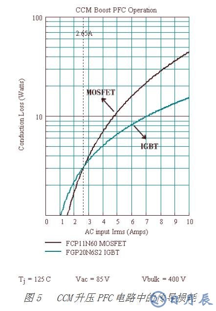 圖5中的示例僅考慮了CCM PFC電路的傳導(dǎo)損耗,即假定設(shè)計(jì)目標(biāo)在維持最差情況下的傳導(dǎo)損耗小于15W。以FCP11N60 MOSFET為例,該電路被限制在5.8A,而FGP20N6S2 IGBT可以在9.8A的交流輸入電流下工作。它可以傳導(dǎo)超過MOSFET 70% 的功率。