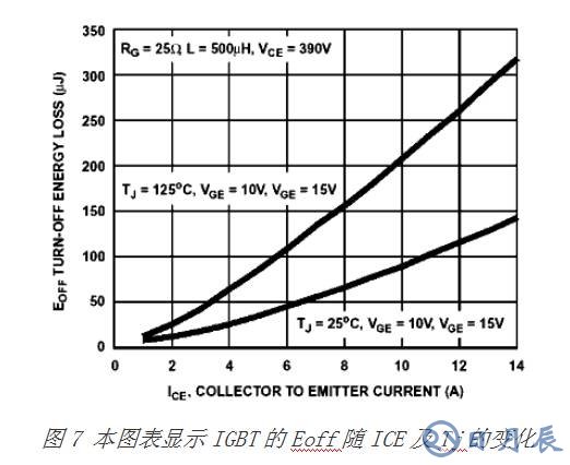 在硬開關(guān)、鉗位感性電路中,MOSFET的關(guān)斷損耗比IGBT低得多,原因在于IGBT 的拖尾電流,這與清除圖1中PNP BJT的少數(shù)載流子有關(guān)。圖7顯示了集電極電流ICE和結(jié)溫Tj的函數(shù)Eoff,其曲線在大多數(shù)IGBT數(shù)據(jù)表中都有提供。 這些曲線基于鉗位感性電路且測(cè)試電壓相同,并包含拖尾電流能量損耗。