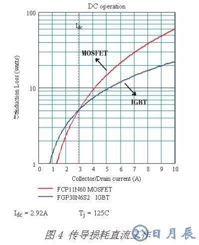 在比較額定值為600V的器件時(shí),IGBT的傳導(dǎo)損耗一般比相同芯片大小的600 V MOSFET少。這種比較應(yīng)該是在集電極和漏極電流密度可明顯感測(cè),并在指明最差情況下的工作結(jié)溫下進(jìn)行的。例如,F(xiàn)GP20N6S2 SMPS2 IGBT 和 FCP11N60 SuperFET均具有1℃/W的RθJC值。圖4顯示了在125℃的結(jié)溫下傳導(dǎo)損耗與直流電流的關(guān)系,圖中曲線表明在直流電流大于2.92A后,MOSFET的傳導(dǎo)損耗更大。