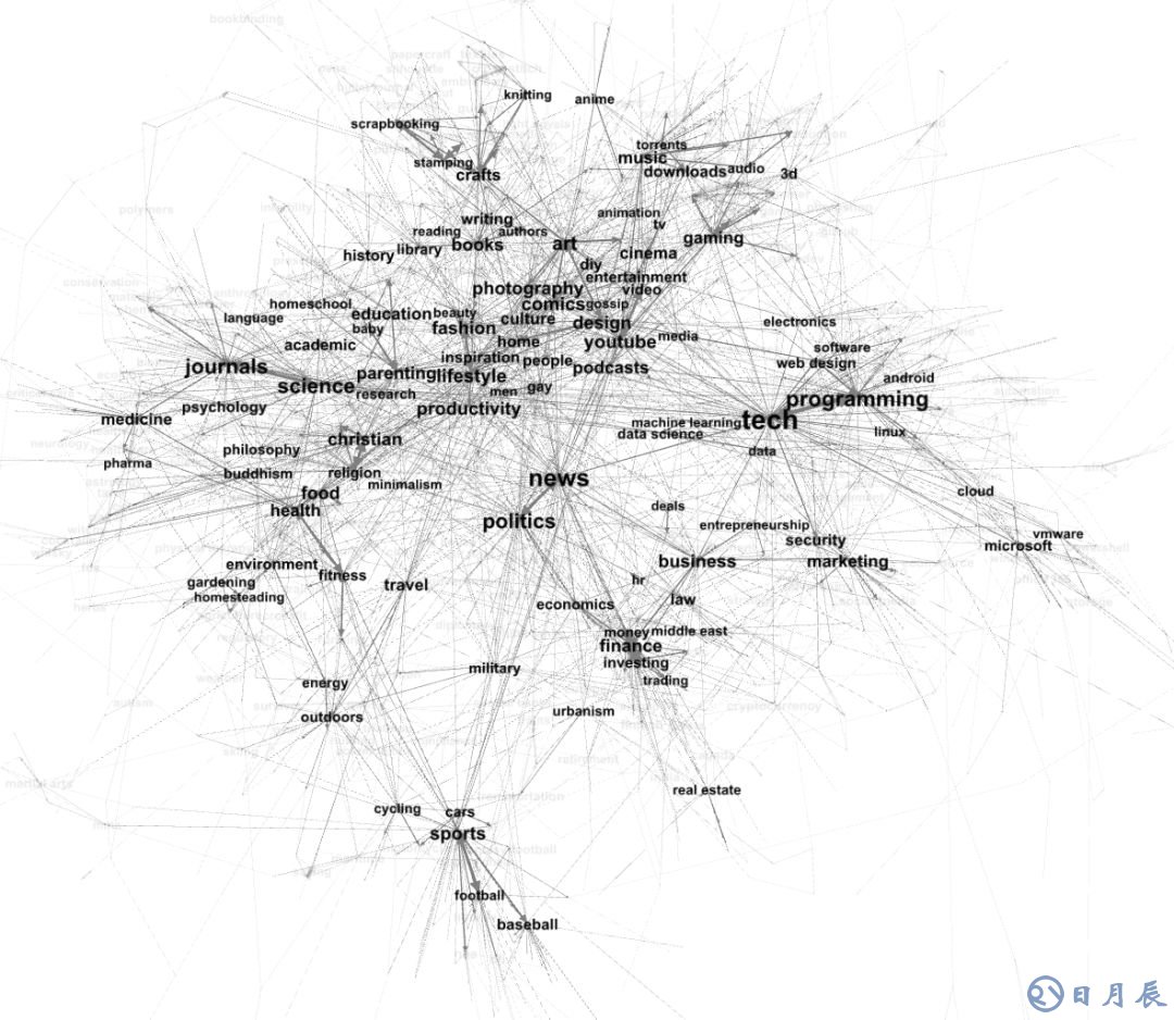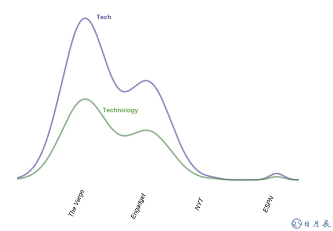 上面的模式也確認了人們以大致相同的方式使用“tech”和“technology”。“technology”的線要細一點,因為人們較少使用這一術(shù)語。不過這兩個主題是重復(fù)的。同時,“Apple”看起來是“tech”的子主題:它連接了更少的信息源,而且它的連接同時也和“tech”相關(guān)。