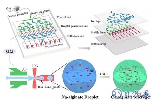 在該工作中,劉海濤等建立了一種基于微流控技術(shù)的雙水相高通量液滴生成新體系,并成功用于負載具有胰島素分泌功能的胰島細胞。實驗中,科研人員設(shè)計了一種集成化多層微流控芯片,并將聚乙二醇(PEG)-葡聚糖(DEX)雙水相體系引入到功能化芯片體系中。通過芯片中單層膜閥(SLM)的機械作用力和對雙水相體系界面能的增大作用,加速其相分離,進一步可控獲得高通量的“水包水”(Water-in-Water)雙水相液滴。這種陣列微液滴用于負載細胞(如胰島細胞)時,可以維持胰島細胞的高存活率和胰島素分泌功能,充分顯示了其作為微凝膠活細胞3D載體的可行性。該研究建立的雙水相微載體制備微流控新體系具有高通量、生物相容性好、液滴載體大小一致和精確可控等優(yōu)勢,在蛋白/多肽類藥物負載、細胞治療、水相功能化微粒合成和組織工程等方面具有重要應(yīng)用前景。