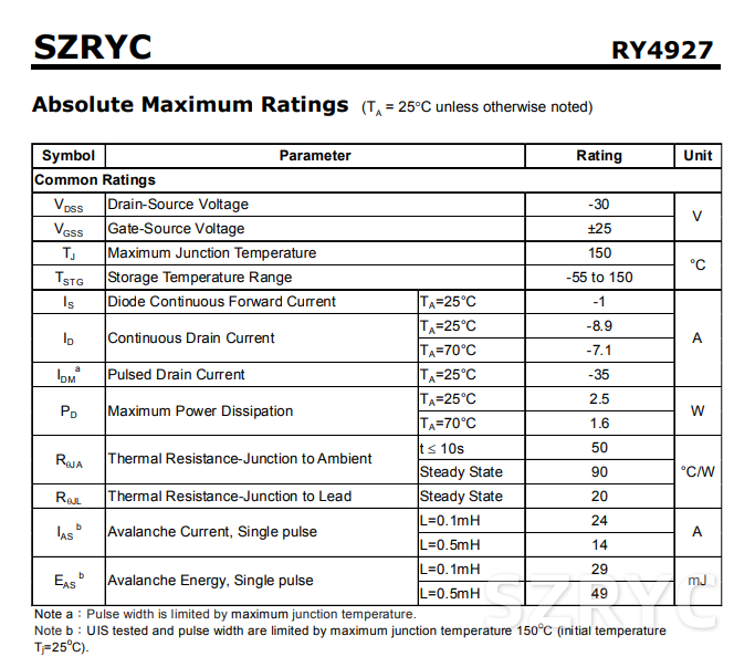 RY4927結(jié)合了先進(jìn)的溝道MOSFET技術(shù)和低電阻封裝,以提供極低的Rds(on)。這種裝置是負(fù)載開關(guān)和電池保護(hù)應(yīng)用的理想選擇。