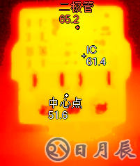 熱成像儀觀測發(fā)熱電源模塊E7805OS-500在標(biāo)稱電壓下的溫度分布,如圖2所示: