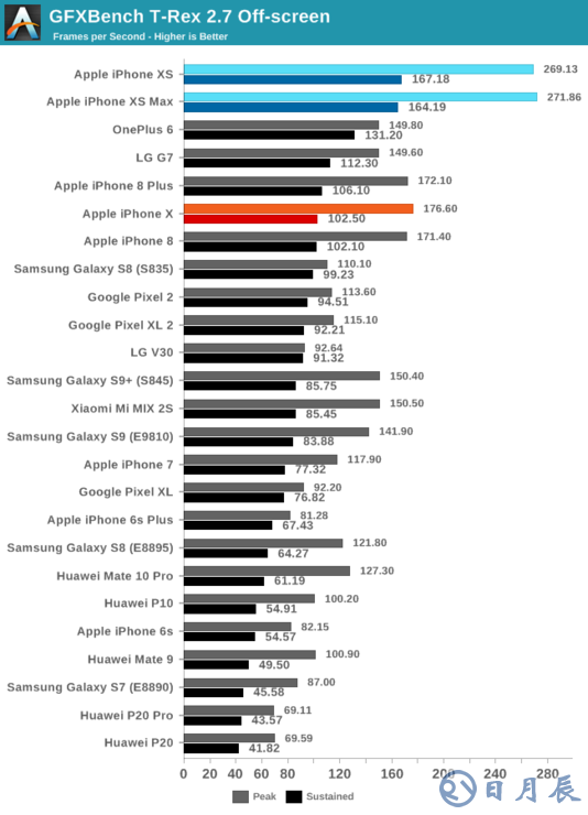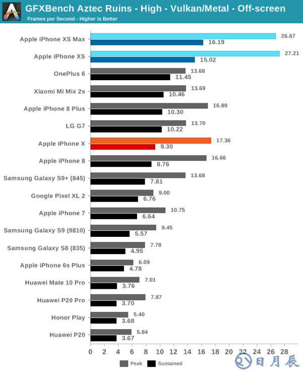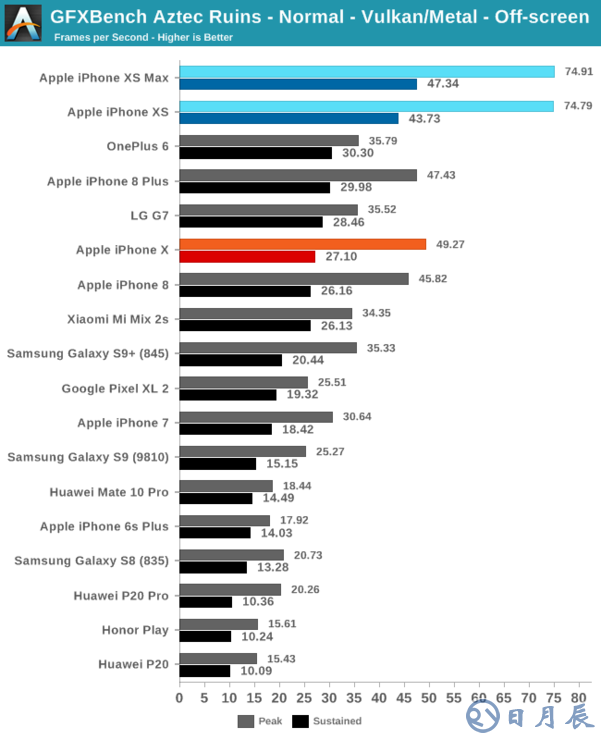 Normal Tier模式下的Aztec Ruins測(cè)試要求相對(duì)較低,iPhone XS的峰值性能相較于去年的iPhone X提升了51%,持續(xù)性能則提升了61%,相比一加6則提升了45%。而在High Tier模式下,iPhone XS的持續(xù)性能比iPhone X高出61%,比一加6則高出31%。