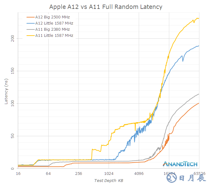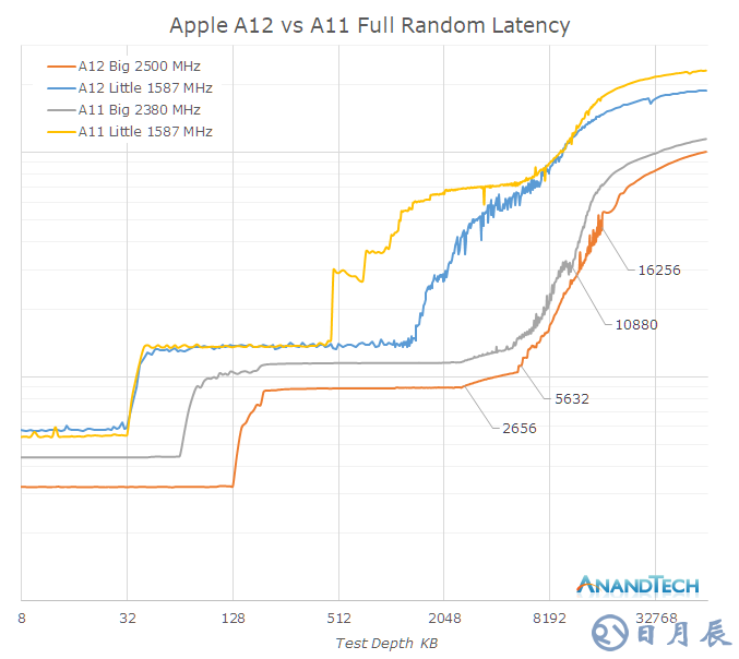 正如之前所提到的,蘋果在A12的緩存結(jié)構(gòu)和內(nèi)存子系統(tǒng)上投入了大量的工作。回到線性延遲圖上,我們看到以下針對(duì)大核和小核的完全隨機(jī)延遲的行為: