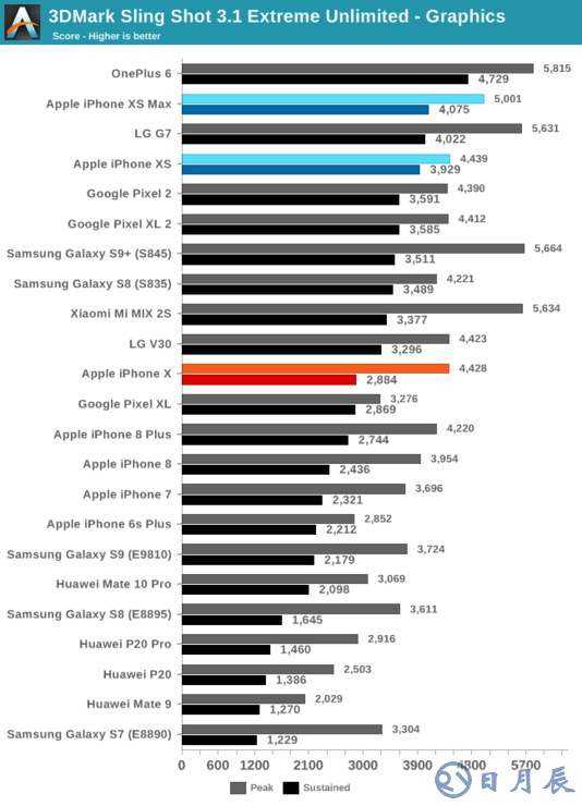 在3DMark測(cè)試的圖形部分,iPhone XS的持續(xù)性能比去年的iPhone X提高了41%,不過一加6更加奔放的功耗和溫度限制讓其性能仍然更勝一籌。