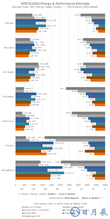 與SPECint測(cè)試類似,A12在SPECfp測(cè)試中的能耗比有明顯提升,在所有測(cè)試中總能量比A11低10%。另一方面A12的功耗也有所增加,平均功耗從3.65瓦上升至4.27瓦,其中433.milc項(xiàng)目的功耗從2.7瓦增至4.2瓦,增加了75%;482.sphinx3項(xiàng)目的功耗則達(dá)到了A12所有SPEC測(cè)試項(xiàng)中的最大值5.35瓦。