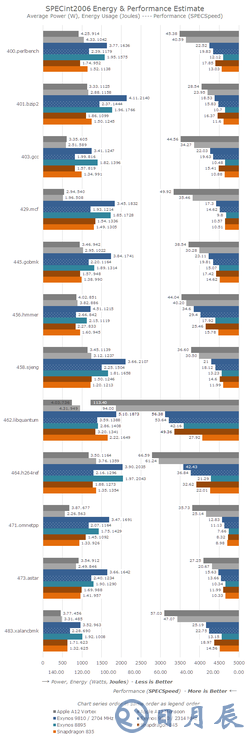 在大多數(shù)工作負(fù)載下,A12的大核心頻率比A11高5%,但實(shí)際上頻率并不是鎖死的,因而在SPECint2006中,A12的表現(xiàn)平均比A11好24%。