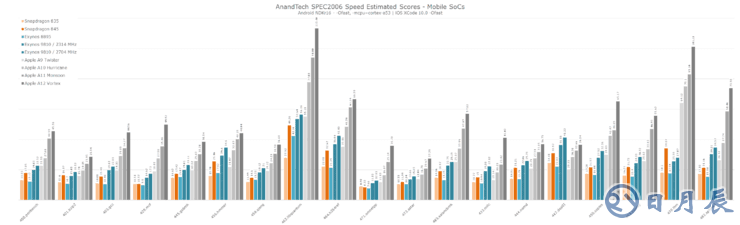 其中增幅最小的是456.hmmer和464.h264ref這兩項(xiàng)測(cè)試,這也是SPECint2006套件中成為瓶頸最多的測(cè)試。由于A12架構(gòu)方面似乎沒有真正的重大變化,小幅增長(zhǎng)主要?dú)w功于更高的頻率以及緩存結(jié)構(gòu)的改進(jìn)。