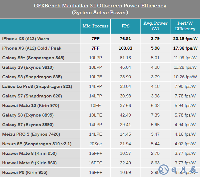 在環(huán)境溫度22°C時(shí),A12測(cè)試曼哈頓3.1時(shí)的峰值功耗達(dá)到6瓦。但即使在這樣的峰值功耗下,A12的效率也超過了所有其他SoC,說明蘋果對(duì)功耗的控制是非常有效的。在運(yùn)行測(cè)試3分鐘后功率回落至合理的3.79瓦,而此時(shí)處理器的能耗比僅相較峰值功耗時(shí)提升了16%,證明A12的能耗比曲線非常平坦,6瓦的峰值功耗仍在芯片本身的可控范圍之內(nèi),足見蘋果在芯片設(shè)計(jì)上的功力之強(qiáng)大。