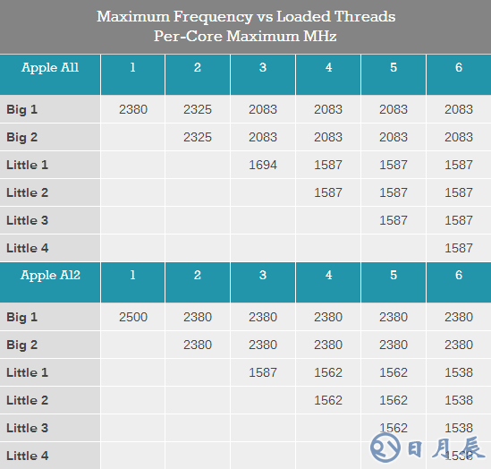A11和A12在單大核心滿載時(shí)的最高頻率分別為2380MHz和2500MHz;雙大核心滿載頻率分別為2325MHz和2380MHz。而在小核心加入工作后,A12的大核心頻率仍被設(shè)計(jì)為穩(wěn)定在2380MHz,而A11則會(huì)進(jìn)一步下調(diào)至2083MHz。