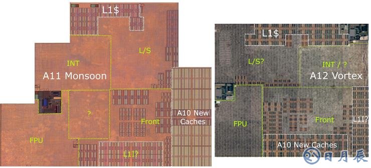 從圖上可以看出,A12的共享緩存被劃分成了4個(gè)區(qū)塊,而此前自A7至A11這5代處理器均為2區(qū)塊設(shè)計(jì)。緩存區(qū)塊的加倍很有可能代表著緩存性能有了很大提升,這個(gè)在稍后的測(cè)試中再見分曉。