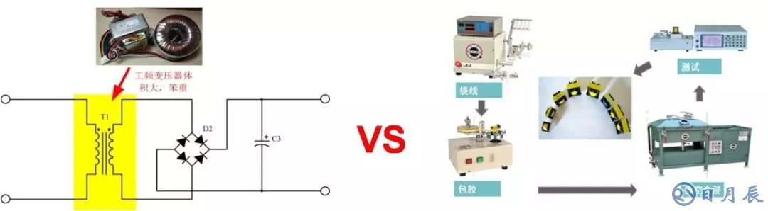 比如設(shè)計(jì)開(kāi)發(fā)一個(gè)市電交流輸入轉(zhuǎn)直流輸出的,很多人的第一時(shí)間就想到采用工頻變換電路方案,因?yàn)榇朔桨副容^簡(jiǎn)單,一個(gè)工頻變壓器,再加上個(gè)整流濾波就可以搞定,如下圖4所示。使用此方案的產(chǎn)品的效率非常低,并且產(chǎn)品的體積會(huì)非常之大,在應(yīng)用中還伴隨著讓人非常鬧心的工頻渦流聲。而模塊方案選用合適的變壓器,并且多重工序?qū)訉颖WC變壓器的產(chǎn)品一致性,保證產(chǎn)品最終性能。