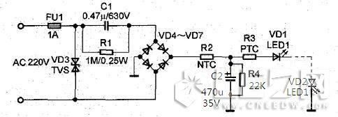 由于電容降壓電源是一種非隔離式電源,在通電瞬間會產(chǎn)生很大的電流,也就是所謂的浪涌電流。此外,由于外界環(huán)境的影響(如雷擊) 電網(wǎng)系統(tǒng)會侵入各種浪涌信號,有些浪涌會導(dǎo)致LED的損壞。所以,要提供熱敏電阻保護,這個主要有負溫度系數(shù)熱敏電阻保護(NTC熱敏電阻,NTC是Negative Temperature Coefficient的縮寫)和正溫度系數(shù)熱敏電阻保護(PTC(Positive Temperature Coefficient))然后有瞬態(tài)電壓抑制器保護((Transient Voltage Suppressor),簡稱TVS)
