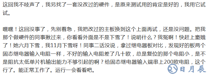 這么個(gè)小東西程序不超過2K怎么這么多問題?我不至于這么爛吧?這么個(gè)小程序都寫不好?還得試找出問題!反復(fù)試了幾十次發(fā)現(xiàn)規(guī)律了,只要是自動(dòng)狀態(tài)的1號(hào)狀態(tài)再和數(shù)字表一通訊就復(fù)位,是不是485通訊沒加隔離的問題?動(dòng)手加隔離(這里要說一下我們的軟硬件是兩個(gè)人負(fù)責(zé)的,我做軟件,另一個(gè)同事專做硬件),我的同事剛才加了按鍵的隔離這回又加485的隔離,為了增加隔離電源又在原裝置的基礎(chǔ)上改了電源。改完了裝上測試,還復(fù)位!天啊!我同事都不用好眼色看我了!
