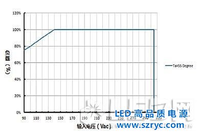 如圖2所示,藍色曲線表示LED驅(qū)動器在環(huán)境溫度55℃時,其輸出功率隨輸入電壓變化的降額曲線。當輸入電壓為140Vac時,驅(qū)動器的負載允許100%滿載,隨著輸入電壓下調(diào);若輸出功率不變,輸入電流將上升,導致輸入端損耗加大,效率降低,器件溫度上升,個別溫度點將可能超標,甚至可能導致器件失效。