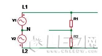 如圖3所示,V1表示第一相電壓,V2表示第二相電壓,R1及R2分別表示正常安裝到線路中的LED驅(qū)動器。當線路上零線(N)如圖斷開時,兩個支路上的驅(qū)動器R1,R2相當于串聯(lián)后接到380Vac電壓上。因為輸入內(nèi)阻差異,當其中一個驅(qū)動器充電到啟動時,內(nèi)阻變小,電壓可能大部分加到另外一個驅(qū)動器上,導致其過壓損壞失效。因此建議同一配電支路上,開關或斷路器要一起斷,不能只斷開零線。配電保險絲不要放在零線上,線路上要避免零線接觸不良。