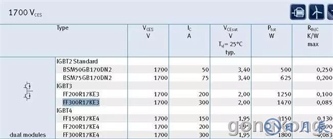 在管子的側(cè)面有型號的,當(dāng)然你等他炸了才看,那是看不到的,至于如何檢查,說句實話咱心里真沒底,幸好有度娘啊,可以找到這個型號的參數(shù),也證實了現(xiàn)場和施工單位的技術(shù)人員討論(其實是爭論)的一個事實,他建議要求變頻器廠家把這個IGBT改成300A的,然后我依稀記得這個型號就是300A的,告訴現(xiàn)場本身就是300A的;