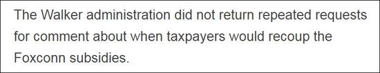 “沃克政府對納稅人將何時收回對富士康的補貼的反復(fù)質(zhì)疑始終不予置評。”