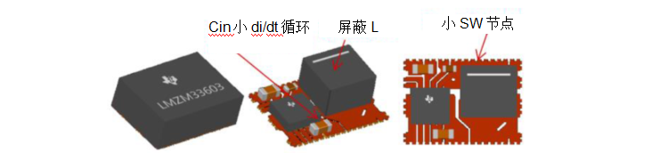 如圖3所示,由于模塊電源集成了很多無(wú)源器件,使得開(kāi)關(guān)節(jié)點(diǎn)區(qū)域得到了很好的優(yōu)化。