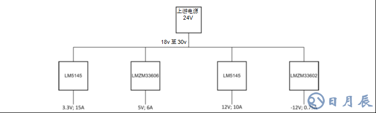 在這種空間受限的環(huán)境中,電源模塊成為實(shí)用的選擇。在適用時(shí),使用它們可大大減少空間限制并縮短產(chǎn)品上市時(shí)間。圖6中的電源樹(shù)所示為可用于臺(tái)式PXIe機(jī)箱中的背板電源的電源模塊和分立穩(wěn)壓器。