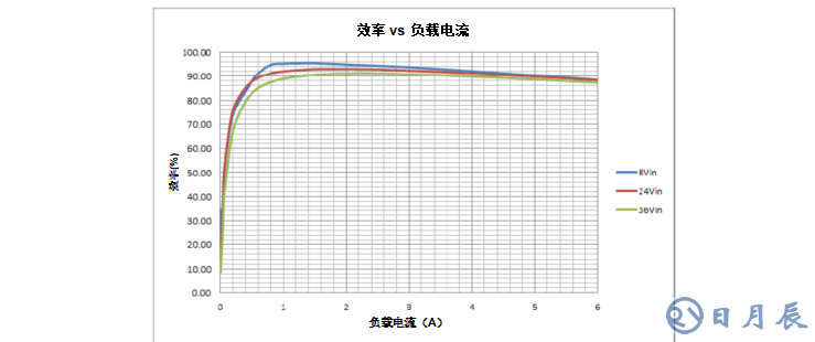 圖5中的模塊原理圖非常簡(jiǎn)單。具有如此低的周邊元件數(shù)目,所得到的設(shè)計(jì)將占用極小的空間。圖6所示為L(zhǎng)MZM33606在多個(gè)輸入電壓下的負(fù)載電流效率。