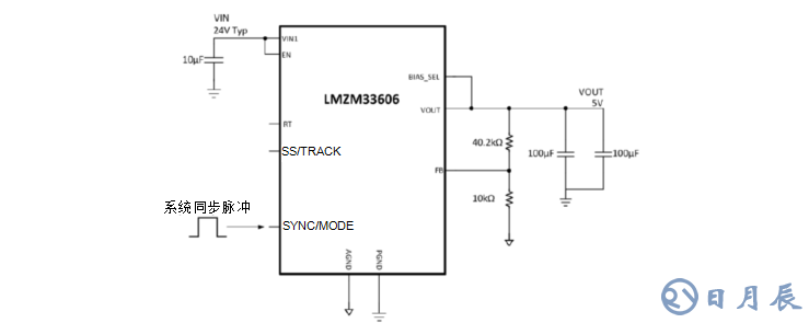 為幫助解決此問(wèn)題,TI LMZM33603和LMZM33606等電源模塊配備了頻率同步輸入引腳,可使系統(tǒng)中的所有降壓穩(wěn)壓器以一個(gè)公共頻率進(jìn)行切換。此功能不僅有助于避免拍??頻,還能將FSW諧波保持在已知頻率。接著,設(shè)計(jì)一個(gè)減輕EMI的輸入濾波器變得更加容易。圖5所示為使用LMZM33606電源模塊的典型原理圖。