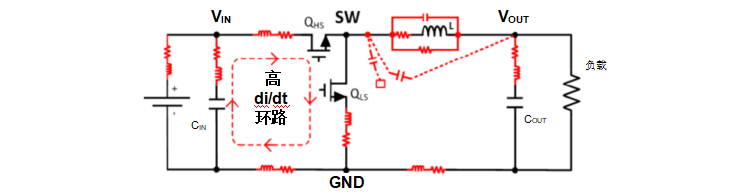 由連接走線(xiàn)包圍的區(qū)域決定了在此不連續(xù)電流的路徑中將存在多少寄生電感。公式1表明,流經(jīng)電感的開(kāi)關(guān)電流會(huì)在其兩端產(chǎn)生電壓差。
