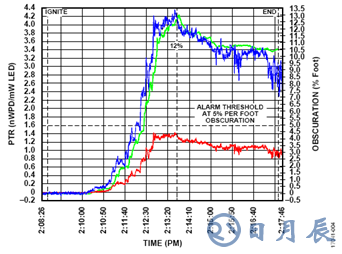 圖4顯示了燃燒聚氨酯測試的例子。在此例中,白色曲線是參考光束的響應(yīng),用右側(cè)y軸上每英尺的遮蔽百分比表示。藍色曲線是對藍光LED的響應(yīng)。紅色曲線是對紅外LED的響應(yīng)。藍光和紅外響應(yīng)均表示為左側(cè)y軸上的PTR,單位為nW/mW。參考光束響應(yīng)顯示了遮蔽水平如何隨時間變化。藍光和紅外響應(yīng)顯示了不同類型煙霧在不同遮蔽水平下的功率傳輸比率,讓用戶可以根據(jù)所檢測的煙霧類型確定所必須的LED功率水平設(shè)置,以在特定閾值水平觸發(fā)警報。