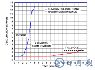 圖8顯示了燃燒聚氨酯和烹飪干擾測試的響應(yīng)與時間的關(guān)系。此圖表明,燃燒聚氨酯測試達到報警閾值的速度(約3.5分鐘)要比烹飪干擾測試達到報警所需遮蔽水平的速度(約16.5分鐘)快得多。煙霧報警算法可以使用此時間信息來區(qū)分燃燒聚氨酯產(chǎn)生的煙霧和烹飪煙霧,最終確定是否觸發(fā)警報。