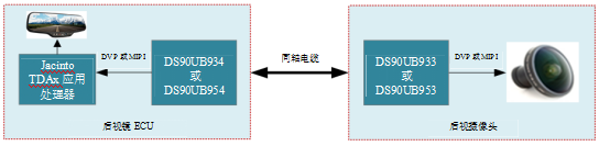 從車輛后方來看,成像器的視頻數(shù)據(jù)輸入到TI的DS90UB933并行接口串行器或具有攝像串行接口(CSI)-2的DS90UB953串行器。然后將這些數(shù)據(jù)通過平板顯示器(FPD)-LinkIII同軸電纜串行到DS90UB934或DS90UB954解串器,然后輸出到應用處理器進行視頻處理(例如JacintoTM?TDAx處理器),然后顯示在后視鏡顯示屏上。如果顯示屏遠離Jacinto應用處理器,則需要顯示接口串行器和解串器將數(shù)據(jù)通過同軸電纜再次路由。您可以分別使用DS90UB921和DS90UB922紅綠藍(RGB)格式串行器和解串器,或者,如果您要應用更高分辨率的顯示屏,則可以使用DS90UB947和DS90UB948開路低壓差分信號顯示接口(LDI)器件。
