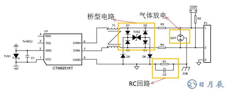 隔離收發(fā)器能為后級主板提供絕對的隔離防護,但同時自身也需要防護,因為隔離收發(fā)器被損壞通訊也將中斷。以CTM8251K(A)T為例,它的浪涌等級可以達到IEC/EN 61000-4-5 共模/差模±2kV,足以應(yīng)對絕大部分工業(yè)場合。從可靠性上考慮,即使在惡劣環(huán)境中選用隔離收發(fā)器,我們?nèi)越ㄗh您在外圍添加保護電路。