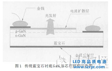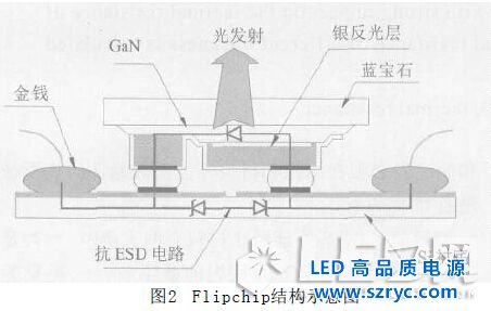 因此這種p 型接觸結(jié)構(gòu)制約了LED 芯片的工作功率。同時(shí)這種結(jié)構(gòu)pn結(jié)的熱量通過藍(lán)寶石襯底導(dǎo)出去,導(dǎo)熱路徑較長(zhǎng),由于藍(lán)寶石的熱導(dǎo)系數(shù)較金屬低(為3 5 W / m ·K ),因此,這種結(jié)構(gòu)的L E D芯片熱阻會(huì)較大。此外,這種結(jié)構(gòu)的p電極和引線也會(huì)擋住部分光線進(jìn)入器件封裝,所以,這種正裝LED芯片的器件功率、出光效率和熱性能均不可能是最優(yōu)的。為了克服正裝芯片的這些不足,L u m i l e d s Lighting公司發(fā)明了倒裝芯片(Flipchip)結(jié)構(gòu),如圖2 所示。在這種結(jié)構(gòu)中,光從藍(lán)寶石襯底取出,不必從電流擴(kuò)散層取出。由于不從電流擴(kuò)散層取光,這樣不透光的電流擴(kuò)散層可以加厚,增加Flipchip的電流密度。同時(shí)這種結(jié)構(gòu)還可以將pn結(jié)的熱量直接通過金屬凸點(diǎn)導(dǎo)給熱導(dǎo)系數(shù)高的硅襯底(為1 4 5 W / m ·K ),散熱效果更優(yōu);而且在p n結(jié)與p 電極之間增加了一個(gè)反光層,又消除了電極和引線的擋光,因此這種結(jié)構(gòu)具有電、光、熱等方面最優(yōu)的特性。本文僅對(duì)藍(lán)寶石GaN倒裝芯片的襯底粘接材料對(duì)大功率LED器件熱特性的影響進(jìn)行分析。
