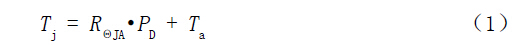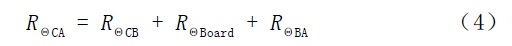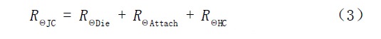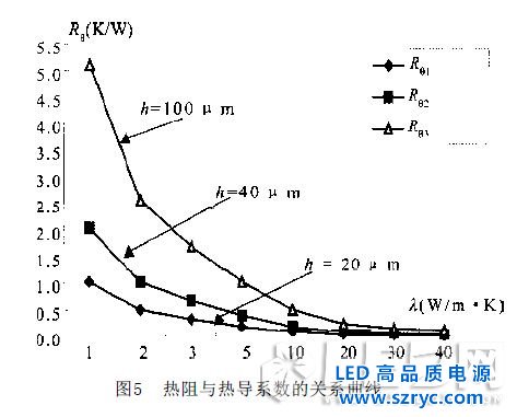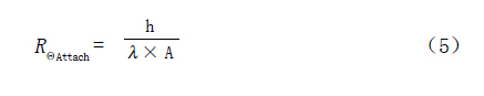 這三種情況的熱阻與熱導(dǎo)系數(shù)的關(guān)系曲線如圖5所示。從圖中可以看出,當(dāng)選用鉛錫焊料63Sn/37Pb ,λ =39W/m ·K ,同時(shí)其厚度等于20 μ m時(shí),R θ Attach 等于0.026(K / W),即使其厚度為100 μ m,R Θ Attach 也只等于0.131(K/W);當(dāng)選用熱沉粘接膠Ablefilm 5020K,λ =0.7W/m·K,同時(shí)其厚度等于20 μ m 時(shí),R ΘAttach 等于1.457(K/W),當(dāng)其厚度為100 μ m 時(shí),R Θ Attach 等于7.286(K / W ); 當(dāng)我們選用導(dǎo)電型芯片粘接膠Ablebond 84-1LMISR4,λ =2.5W/m·K,同時(shí)其厚度等于20 μ m 時(shí),R ΘAttach 等于0.408(K/W),當(dāng)其厚度為100 μ m 時(shí),R Θ Attach 等于2.041(K/W )。因此,選用不同的粘接材料對(duì)其熱阻存在很大的影響,同時(shí),在印刷或涂敷芯片粘接材料時(shí),如何降低材料厚度也十分重要。