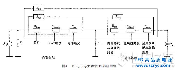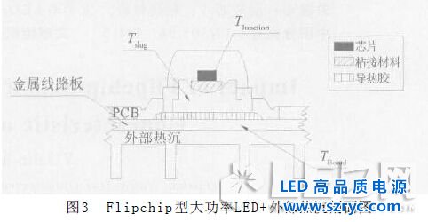 在大功率LED 器件的封裝中,生產(chǎn)廠家容易忽略襯底粘接材料對(duì)器件熱導(dǎo)特性的影響。其實(shí)襯底粘接材料在影響器件熱導(dǎo)特性因素中是一個(gè)比較重要的因素,如果處理不好,將使得LED 的熱阻過大,導(dǎo)致在額定工作條件下器件的結(jié)溫過高,導(dǎo)致器件的出光效率下降、可靠性降低。設(shè)倒裝芯片襯底的橫截面積為A (m 2 ),粘接材料的熱導(dǎo)系數(shù)為λ(W / m ·K ),粘接材料的高度為h ( m ),則粘接材料的熱阻為