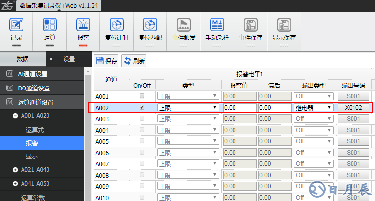 • 運算通道A002選擇ON,運算表達式設(shè)置為:Val(A1)>=600?-1:1;范圍下限-2.00,范圍上限2.00;