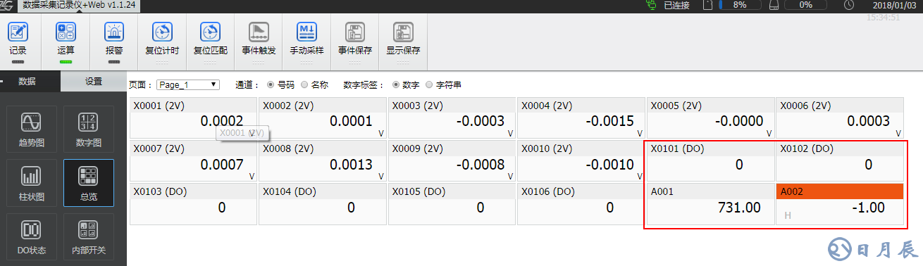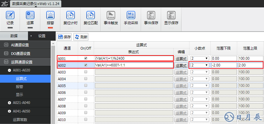 • 運算通道A001選擇ON,運算表達式設(shè)置為:(Val(A1)+1)%2400;