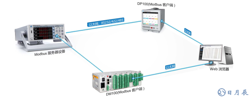 應(yīng)用案例:某電機用戶希望實現(xiàn)電機三分鐘運行、一分鐘停止的連續(xù)工作模式,以及電壓、電流、溫度的同時顯示;利用DM100與PA310通過Modbus通訊實現(xiàn)此測試需求,連接方式如下,最終顯示界面如圖9所示。