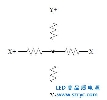 四線電阻式觸摸屏是電阻式觸摸屏中應(yīng)用最廣、最普及的一種。其結(jié)構(gòu)由下線路導(dǎo)電ITO 層和上線路導(dǎo)電ITO 層組成,中間由細(xì)微絕緣點(diǎn)隔開。當(dāng)觸摸屏表面無壓力時,上下線路成開路狀態(tài);一旦有壓力施加到觸摸屏上,上下線路導(dǎo)通,控制器通過下線路導(dǎo)電ITO層在X 坐標(biāo)方向上施加驅(qū)動電壓, 通過上線路導(dǎo)電ITO 層上的探針偵測X 方向上的電壓, 由此推算出觸點(diǎn)的X 坐標(biāo),通過控制器改變施加電壓的方向,同理可測出觸點(diǎn)的Y 坐標(biāo),從而明確觸點(diǎn)的位置。其等效電路如圖3 所示。