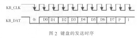 PS2 鍵盤傳輸協(xié)議是以下面的數(shù)據(jù)格式進(jìn)行數(shù)據(jù)傳輸?shù)模? 個起始位(總是邏輯0),8 個數(shù)據(jù)位(低位在前),1 個奇偶校驗(yàn)位(奇校驗(yàn)),1 個停止位(總是邏輯1),1 個應(yīng)答位(僅用于在主機(jī)對設(shè)備的通信中)。鍵盤的發(fā)送時序如圖2 所示。