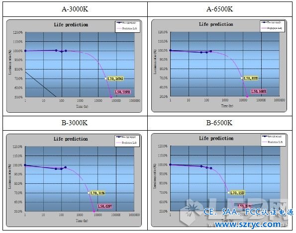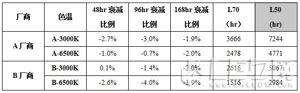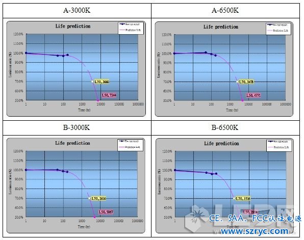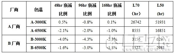 需要說明的一點是:本文中的快速老化試驗所作出的壽命推估只做參考使用,目前還沒有一個快速老化試驗的標準,所以此方法僅作為照明應用廠在同等試驗條件下將多家供應商的LED顆粒進行比較試驗,擇優(yōu)選取的參考。