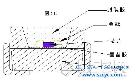 如上圖(1)所示,LED主要的原物料有封裝膠、金線、晶片、固晶膠、支架五個部分。每種物料都會直接影響LED性能。例如較差的封裝膠不但會導致出光效率低,更會導致材料容易受潮,硫化風險增大。