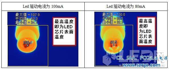 從上圖可以看出,LED驅動電流下降20%,對應的LED芯片表面溫度下降17%。另外130°已經超過了LED芯片的最大承受溫度(一般中小功率芯片為115°,較好點的為125°)。過高的溫度不但導致LED芯片損傷,熒光粉激發(fā)效率降低,也會使支架上的反射蓋黃化,從而最終都會導致LED光衰嚴重。