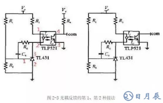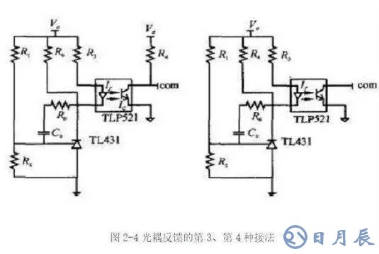 圖2-3所示接法的工作原理是:當(dāng)輸出電壓升高時(shí),原邊電流If增大,輸出電流Ic增大,由于Ic已經(jīng)超過(guò)了電壓誤差放大器的電流輸出能力,com腳電壓下降,占空比減小,輸出電壓減小;反之,當(dāng)輸出電壓下降時(shí),調(diào)節(jié)過(guò)程類(lèi)似。