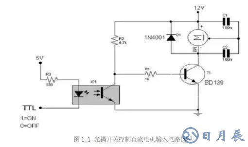 光耦,也稱(chēng)光電隔離器、光耦合器或光電耦合器。它是以光為媒介來(lái)傳輸電信號(hào)的器件,通常把發(fā)光器(紅外LED)與受光器(光敏半導(dǎo)體管)封裝在同一管殼內(nèi)。當(dāng)輸入端加電信號(hào)時(shí)發(fā)光二極管發(fā)出光線,光敏三極管接受光線之后就產(chǎn)生光電流,從輸出端流出,從而實(shí)現(xiàn)了“電—光—電”轉(zhuǎn)換。典型應(yīng)用電路如下圖1-1所示。