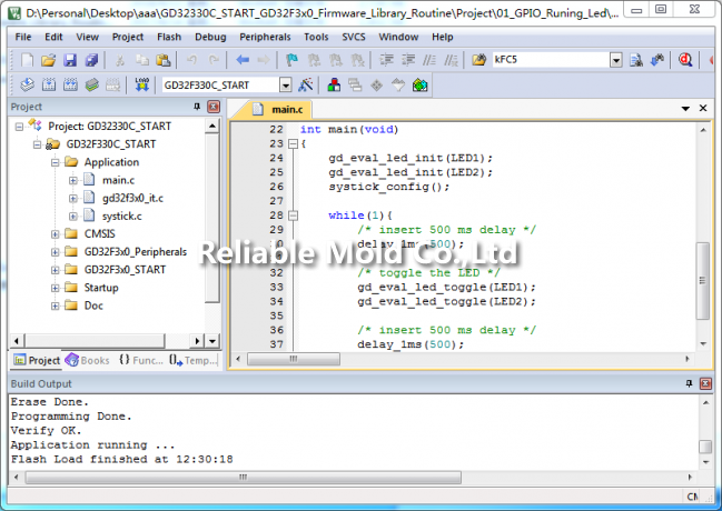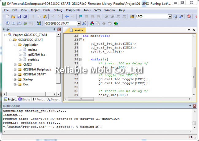 隨后即可以例程01_GPIO_Runing_Led來進行測試,經(jīng)編譯其結(jié)果如圖1所示。