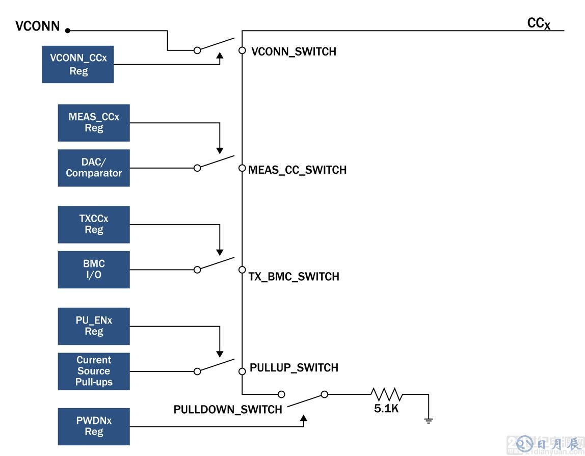FUSB302B實(shí)施了一個(gè)CC開(kāi)關(guān),使它能夠檢測(cè)到它是作為設(shè)備主機(jī)還是雙角色端口連接,通過(guò)多個(gè)比較器和由主機(jī)處理器上的軟件控制的可編程DAC進(jìn)行管理(圖3)。